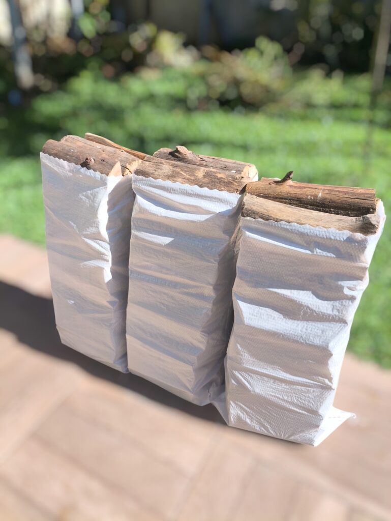 📏 Medida: sacos padronizados com lenha selecionada e cortada uniformemente (cortes de 25 ou 30 cm);